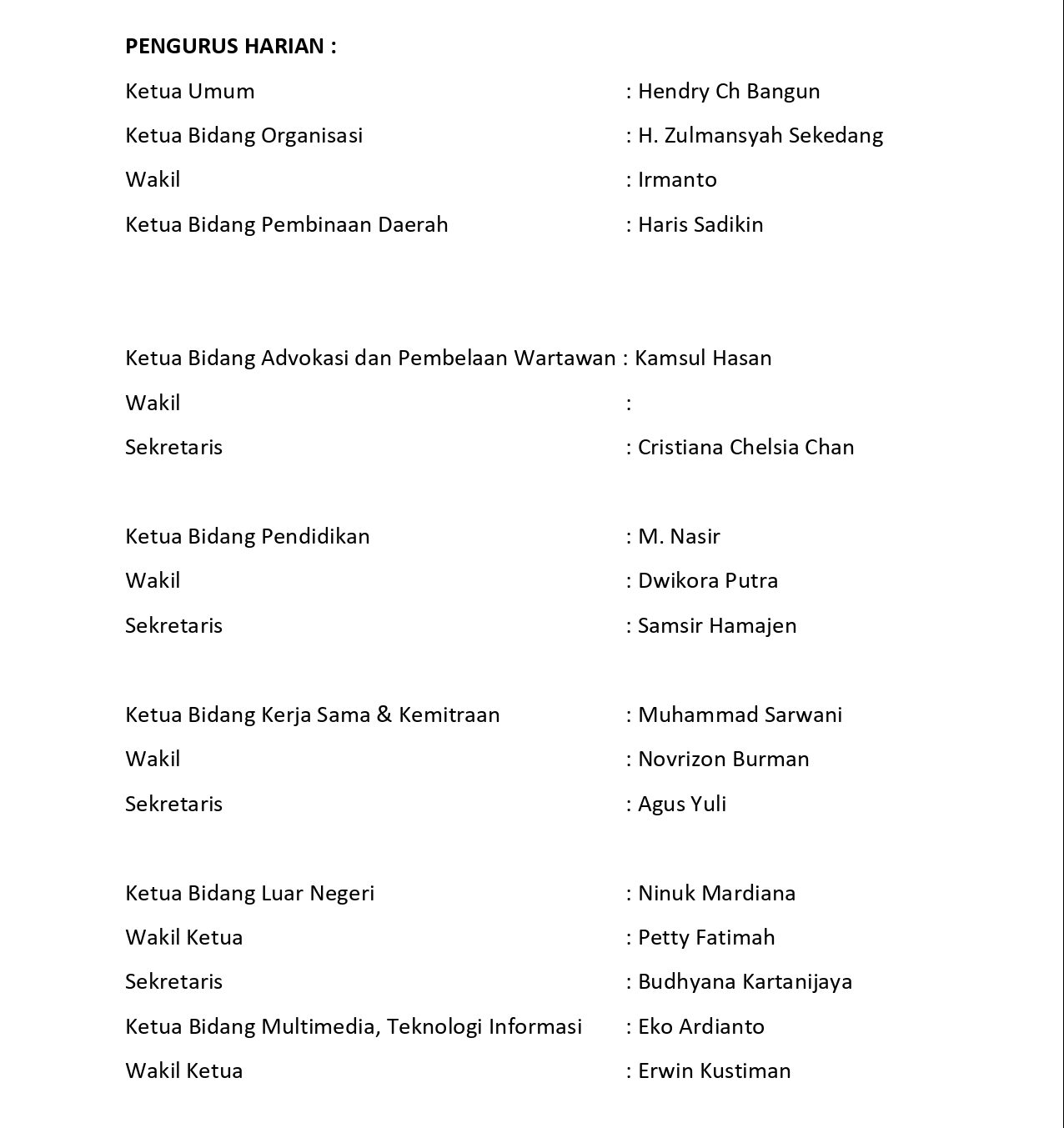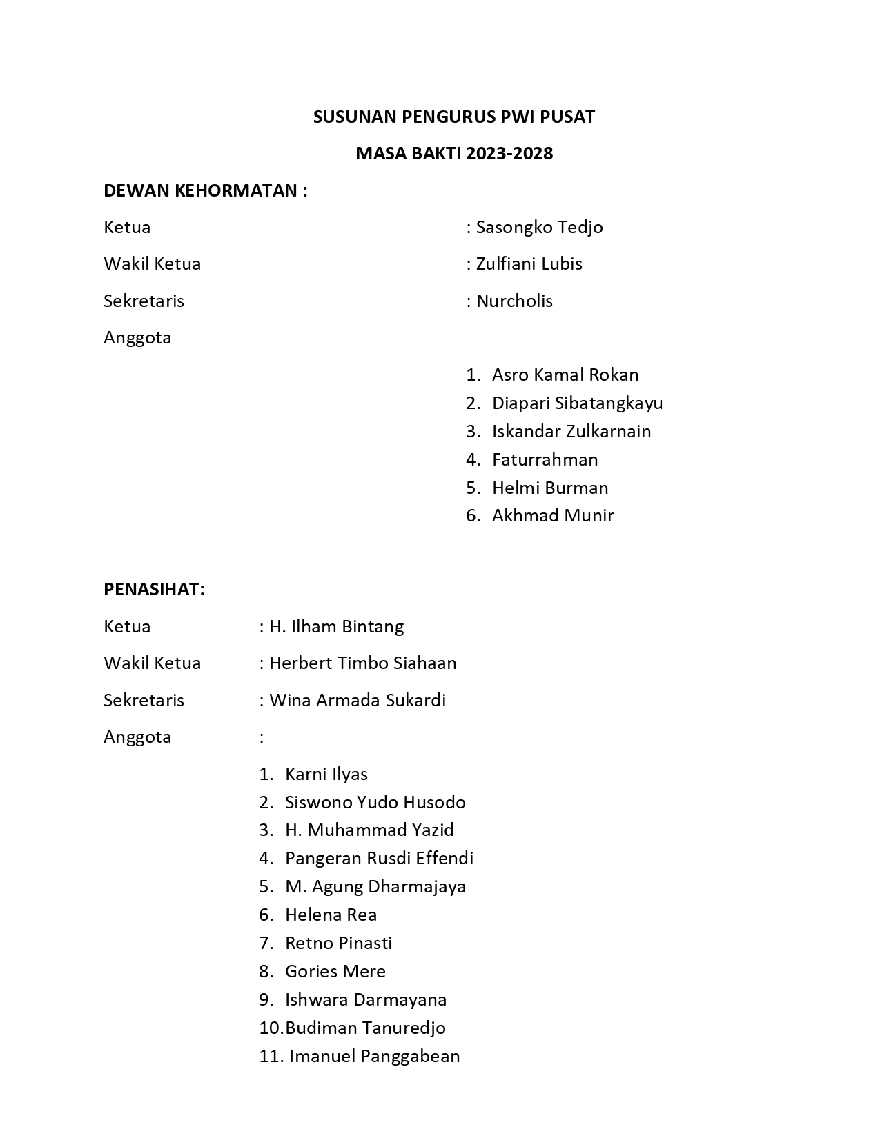 PORTALNUSA.com | JAKARTA – Berikut susunan lengkap pengurus Persatuan Wartawan Indonesia. (PWI) Pusat periode 2023-2028;