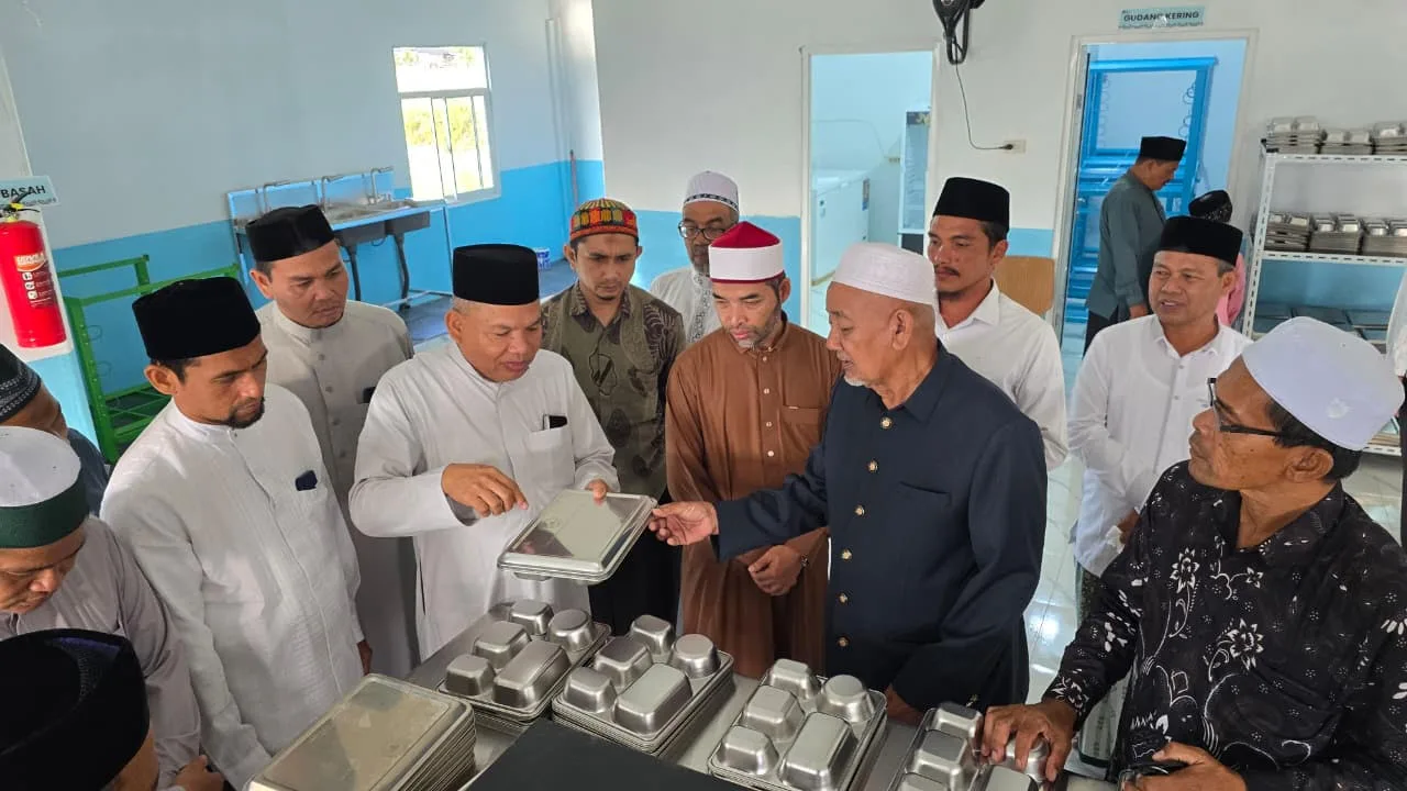 Ketua Pembina YPN Aceh, Ir. Zakaria A. Gani (tiga kiri) menjelaskan kemasan porsi makanan bergizi kepada Ketua MPU Pidie, Tgk. H. Muhammad Ismi atau Abu Ilot (tengah) saat melakukan kunjungan ke dapur BGN di Gampong Tuha, Kemukiman Suwiek, Kecamatan Indra Jaya, Pidie, Rabu, 8 Oktober 2025. (Foto Idris Ismail/Portalnusa.com)