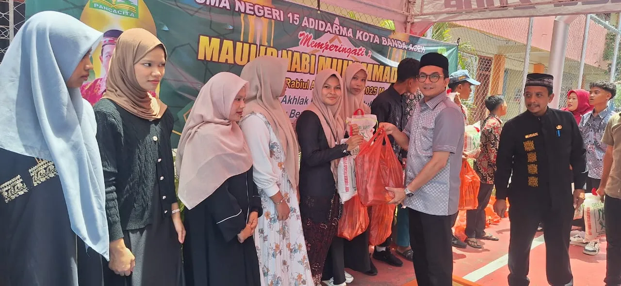 Penyaluran bantuan tersebut berlangsung pada rangkain peringatan Maulid Nabi Muhammad SAW 1447 yang dilaksanakan SMA Negeri 15 Adidarma Banda Aceh, Kamis, 9 Oktober 2025.