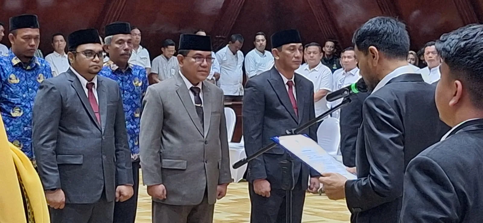 PORTALNUSA.com | BANDA ACEH – Gubernur Aceh, Muzakir Manaf, melantik dan mengambil sumpah jabatan sejumlah pejabat eselon II di lingkungan Pemerintah Aceh. Prosesi pelantikan berlangsung di Anjong Mon Mata, Banda Aceh, Jumat, 10 Oktober 2025.