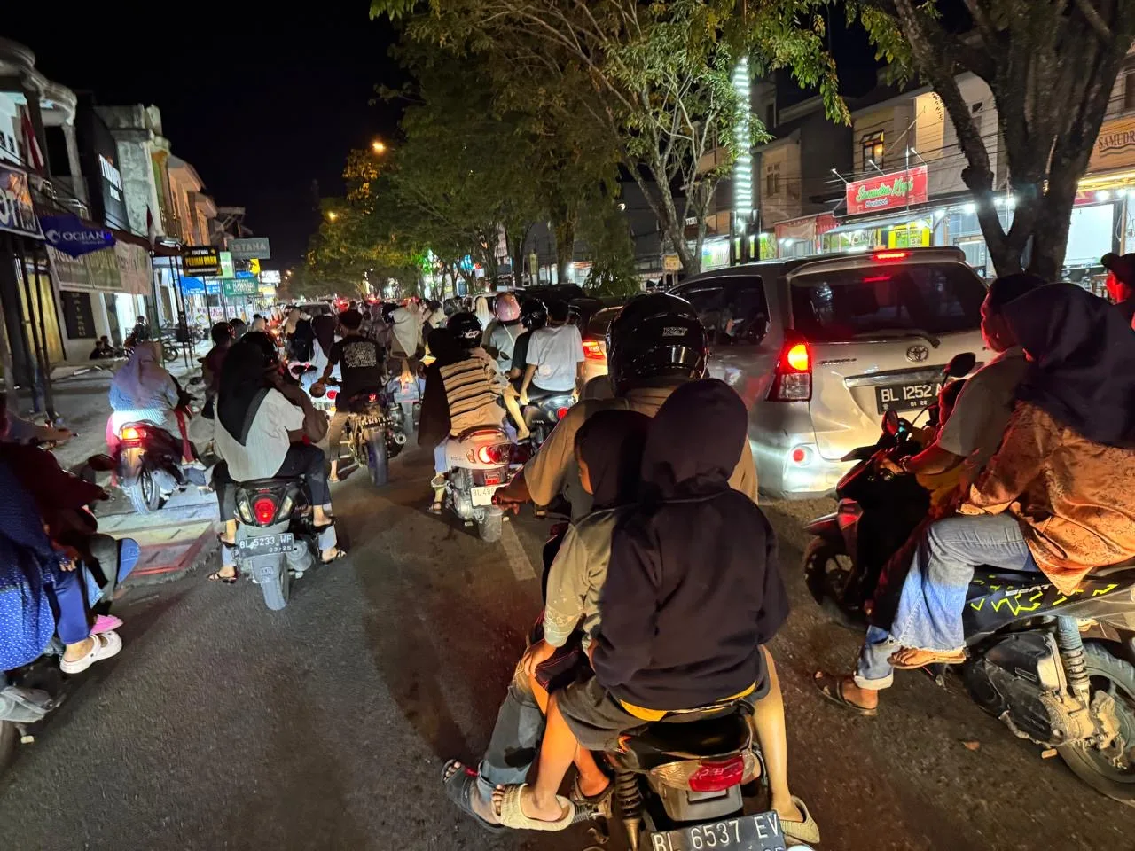 Pergerakan manusia dengan menggunakan berbagai jenis kendaraan terus berlanjut hingga malam. Sejumlah ruas jalan utama di pusat Kota Meulaboh macet total.