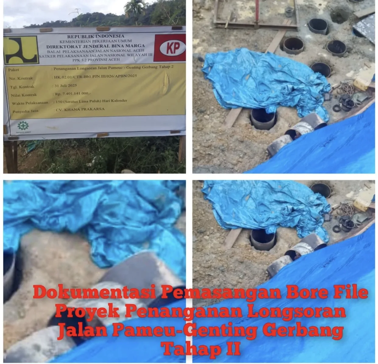 Proyek Penanganan Longsoran Pameu–Genting Gerbang Tahap II dengan pagu anggaran Rp7,401 miliar tersebut berada di bawah Balai Pelaksanaan Jalan Nasional (BPJN) Wilayah Aceh dan dikerjakan oleh CV. KHANA Prakarsa berdasarkan kontrak tertanggal 31 Juli 2025 dengan masa kerja 150 hari kalender.