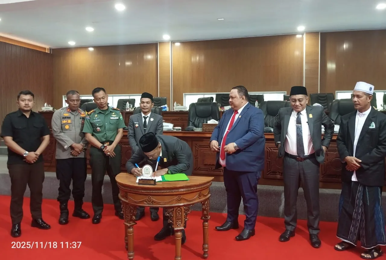 Penandatanganan nota kesepakatan KUA–PPAS APBK Aceh Jaya tahun anggaran 2026, Selasa 18 November 2025.(Foto: Portalnusa.com/Sams)