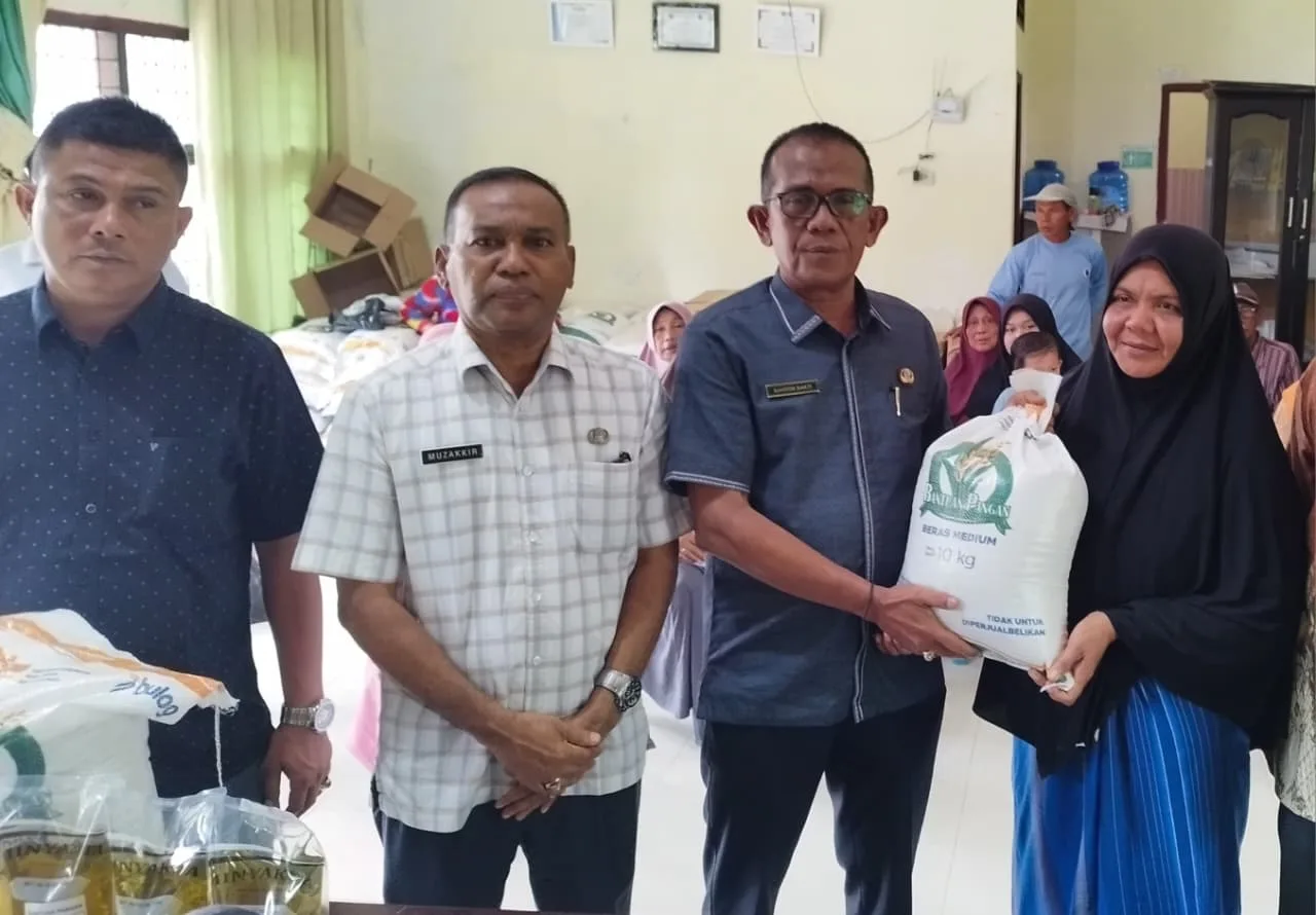 PORTALNUSA.com | PIDIE JAYA –Asisten Perekonomian dan Pembangunan Sekdakab Pidie Jaya, Bahron Bakti didampingi Kadis pertanian dan ketahanan pangan, Muzakkir Muhammad menyerahkan ratusan paket bantuan pangan di kecamatan Ulim, Jumat 21 November 2025.