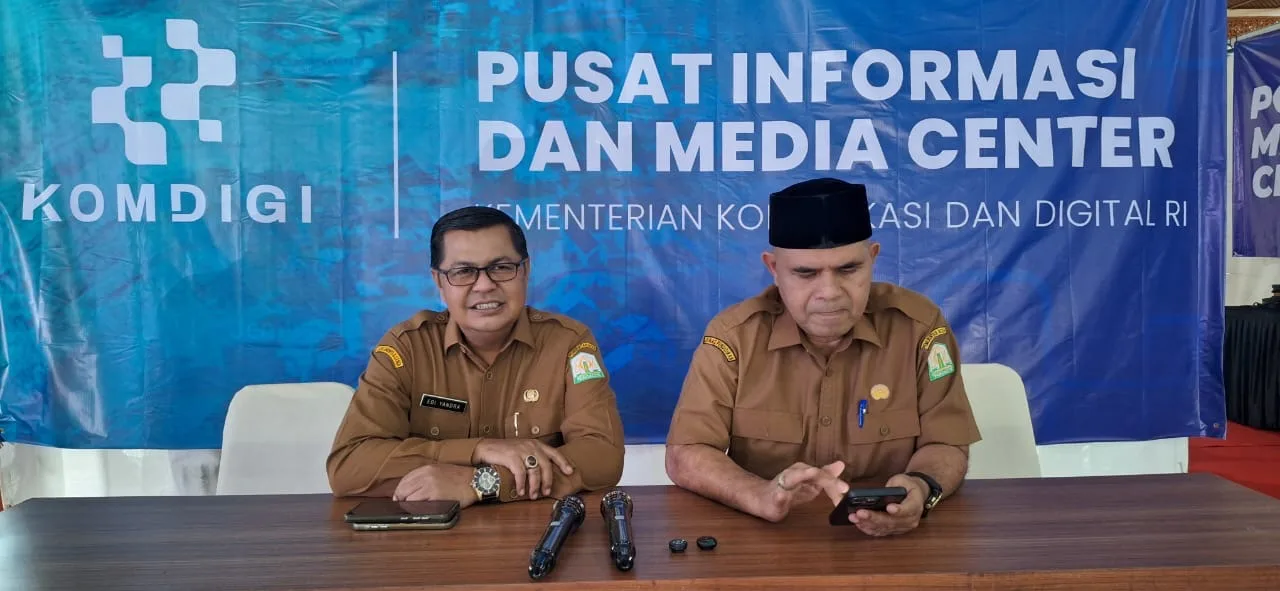 Kadiskominsa Aceh, Edi Yandra didampingi Juru Bicara Pos Komando Tanggap Darurat Bencana Hidrometeorologi Aceh, Murthalamuddin memberikan keterangan pers terkait koneksi internet di Aceh, di Posko Penanganan Bencana Kantor Gubernur Aceh, Selasa, 2 Desember 2025. (Foto Abdul Hadi/Portalnusa.com)