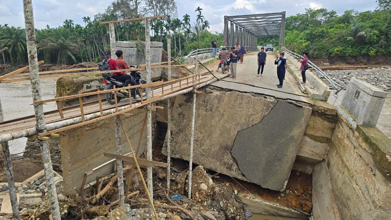 Dijelaskan untuk menyambung sisa jembatan yang ambruk itu, warga berswadaya menyambung dengan batang pinang seadanya secara darurat agar dapat dilintasi sepeda motor guna memantau sisa 38 unit rumah di lereng perbukitan kebun produktif.