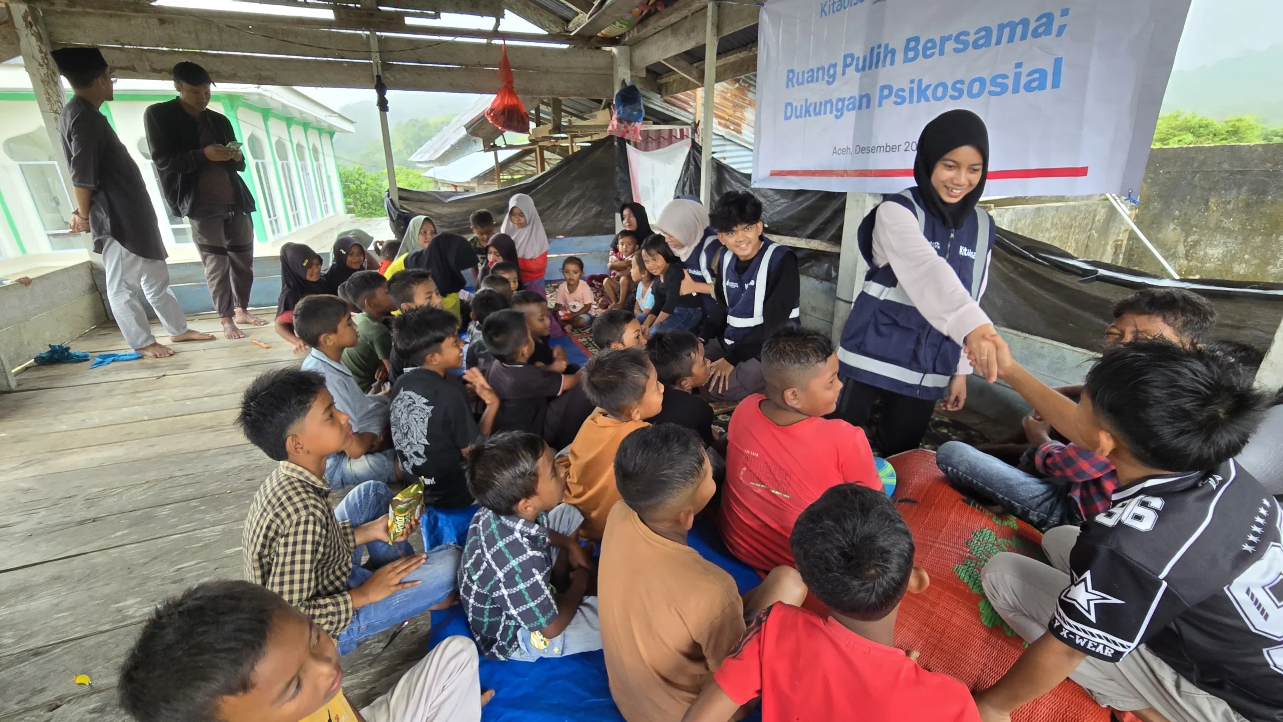 Trauma healing dilakukan di Posko Pengungsi Gampong Blang Pandak, Kecamatan Tangse, Pidie hingga Selasa petang, 15 Desember 2025 untuk 117 anak dan remaja.