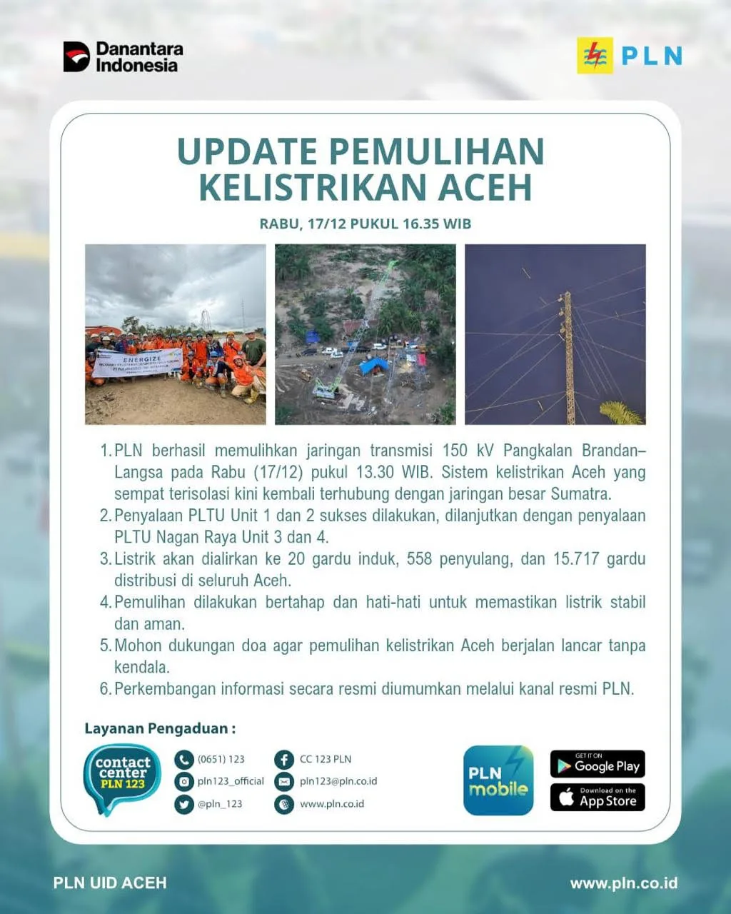Menurut Lukman, informasi tentang pemulihan kelistrikan Aceh tersebut diumumkan secara resmi oleh pihak PLN, Rabu, 17 Desember 2025 pukul 16.35 WIB.