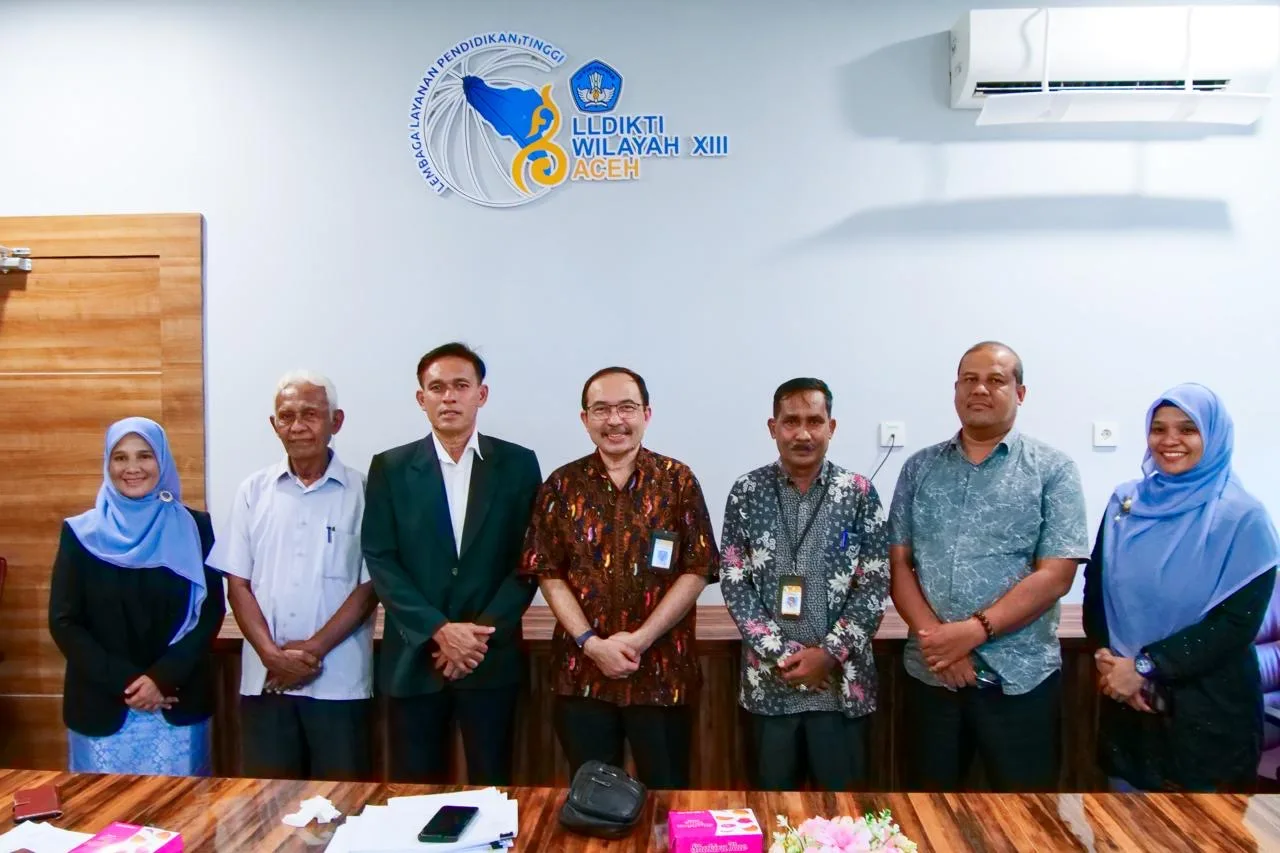 Kepala LLDIKTI Wilayah XIII Aceh, Rizal Munadi (tengah) foto bersama dengan ketua Yayasan Pembangunan Kampus Jabal Ghafur, Teuku Yasman Saputra (tiga kiri) usai penyerahan SK Kemdiktisaintek di Kantor LLDIKTI Wilayah XIII Aceh, Selasa petang, 23 Desember 2025. (Foto Humas INAR Pidie untuk Portalnusa.com)