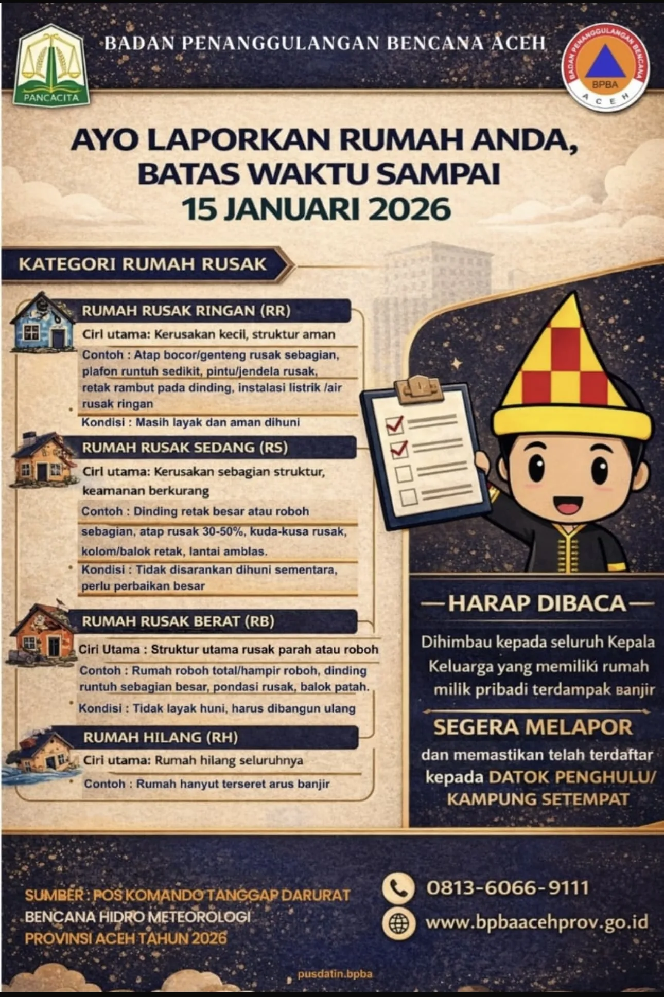 Ia juga menegaskan pentingnya keseragaman dalam surat keputusan (SK) penetapan kerusakan rumah. Mulai dari kategori rusak ringan, sedang, hingga berat, seluruh rumah terdampak harus diusulkan mendapatkan dana perabotan sebesar Rp3 juta per unit.