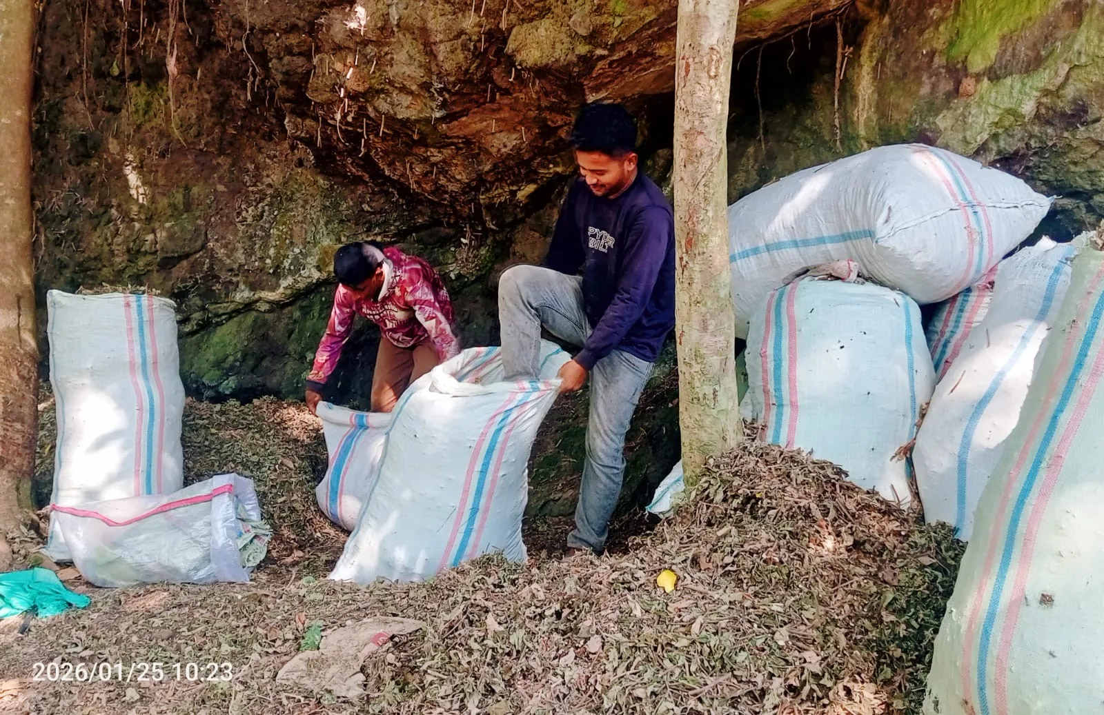 Yusri, petani nilam di Gampong Alue Abed, Kecamatan Panga, Aceh Jaya bersama rekannya seorang buruh sedang mengisi karung goni daun nilam kering. (Foto: Portalnusa.com/Sams)