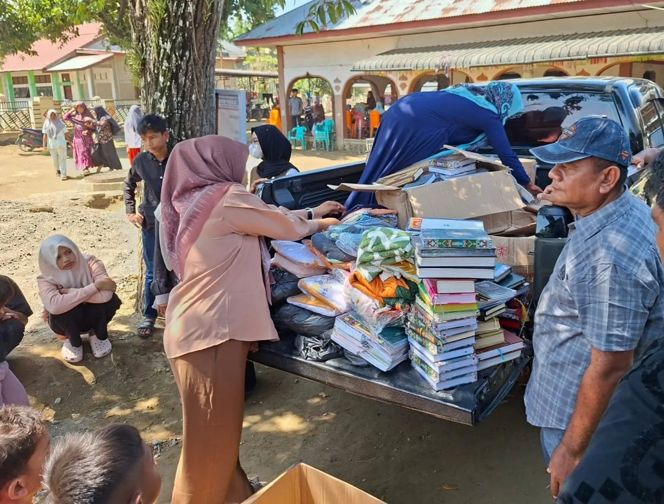 Utusan Dosen Undip Semarang di Aceh, Fauzinur Hamzah (kanan) menyalurkan bantuan mushaf Alquran serta beberapa kebutuhan lainnya untuk warga Gampong Dayah Usien, Kecamatan Meurah Dua, Pidie Jaya, Rabu, 4 Februari 2026. (Foto Fauzinur Hamzah untuk Portalnusa.com)