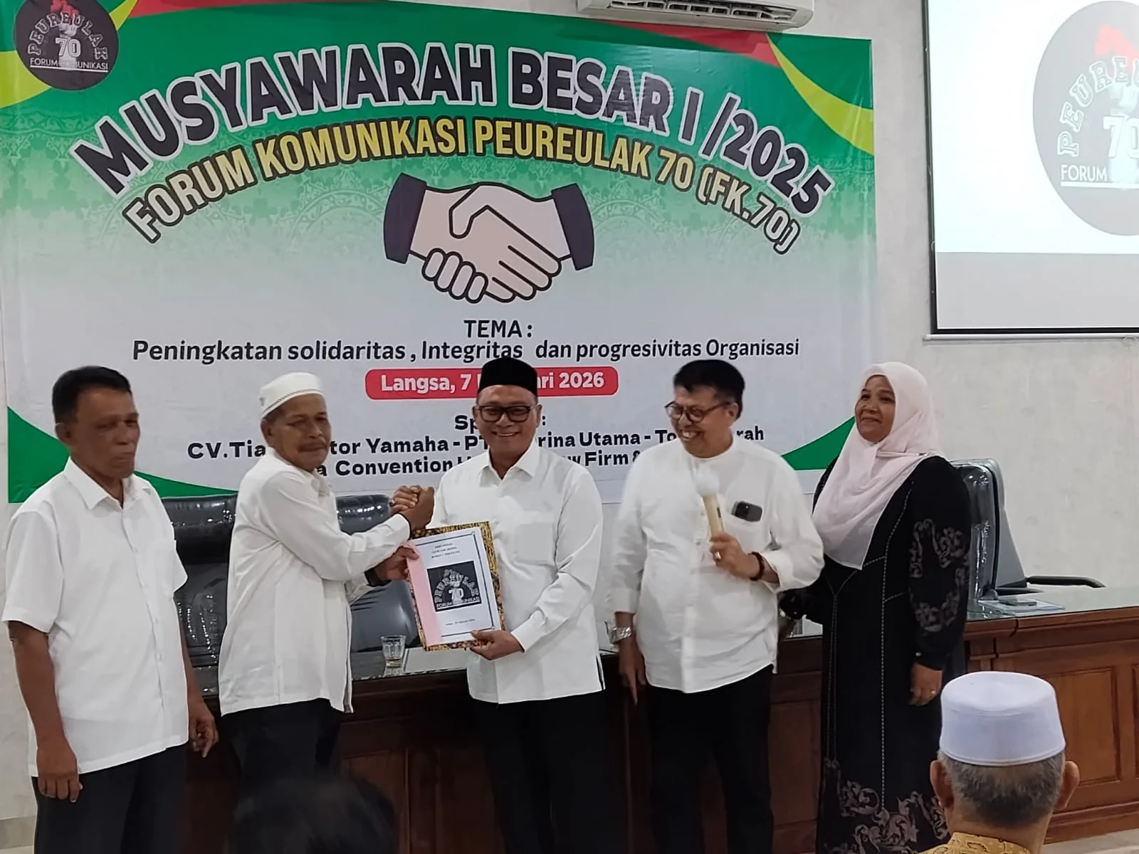PORTALNUSA.com | LANGSA – H. Agussalim kembali terpilih sebagai Ketua Umum Forum Komunikasi Peureulak 70 (FK-P70) untuk periode 2025–2030. Ia terpilih secara aklamasi dalam Musyawarah Besar (Mubes) I FK-P70 yang di Aula Vitra Convention Hall, Langsa, Sabtu malam, 7 Februari 2026.