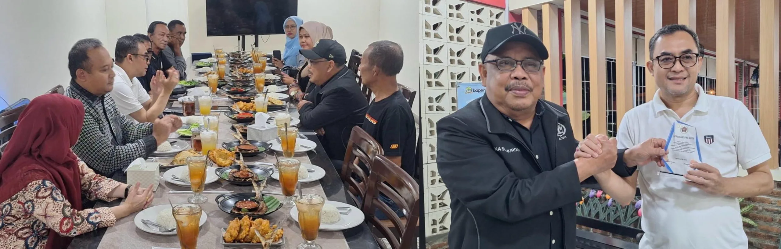 Kadisperindag Provinsi Banten, Dr. Iwan Hermawan, ST., MM didampingi Sekretaris Disperindag, Dr. Tb. Regiasa Fajar, SE., MT.P bersama staf menjamu makan malam rombongan PWI Aceh pada pengujung kegiatan HPN 2026 di Kota Serang, Senin malam, 9 Februari 2026. Sedangkan foto kanan, Ketua PWI Aceh, Nasir Nurdin memberikan plakat ucapan terima kasih kepada Kadisperindag Banten yang telah mendampingi rombongan PWI Aceh selama mengikuti kegiatan HPN di Kota Serang sejak 6 Februari 2026. (Foto Abdul Hadi/PWI Aceh)