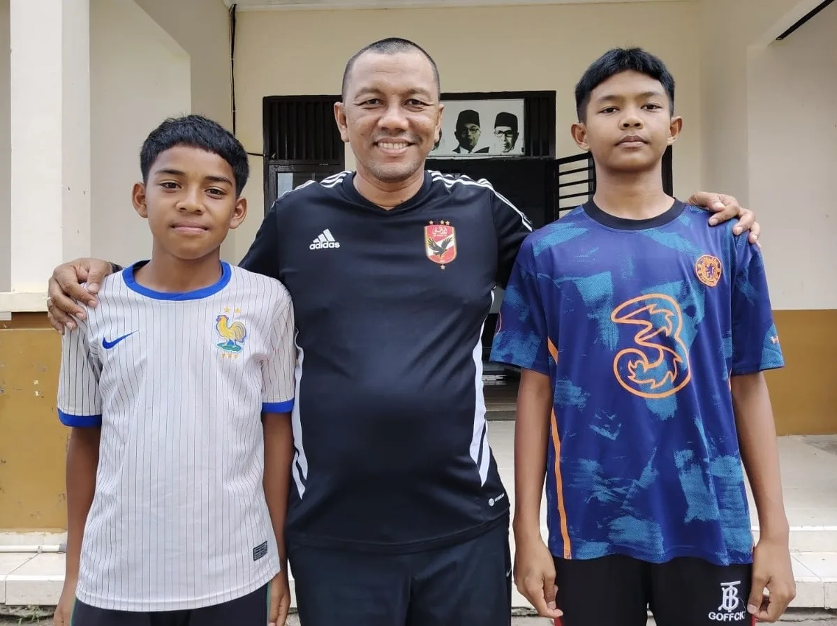Pimpinan Pesantren Al Zahrah, M. Fadhil Rahmi bersama dua dari tiga santrinya yang lolos seleksi Umur 15 tahun (U 15) tim Juang FC Bireuen. (Dok Al Zahra)