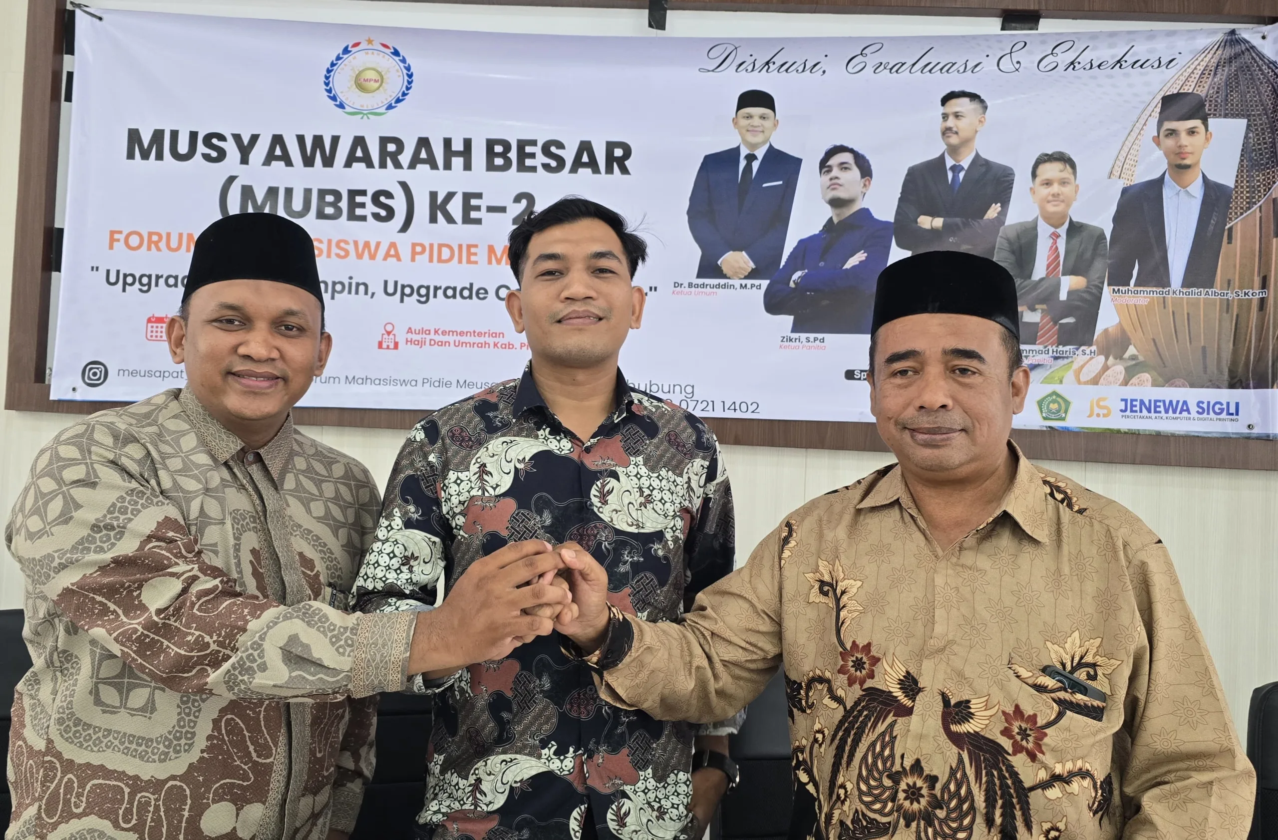 Ketua terpilih FMPM periode 2026–2031, Zikri, S.Pd (tengah) salam komando dengan mantan Ketua Umum Dr. Badruddin, M.Pd (kiri), didampingi tokoh agama, Drs. Tgk Muhammad Tiro (kanan), usai Mubes II FMPM di Aula PLHUT Kankemenag Pidie, Sabtu, 28 Maret 2026. (Foto: Idris Ismail/Portalnusa.com)