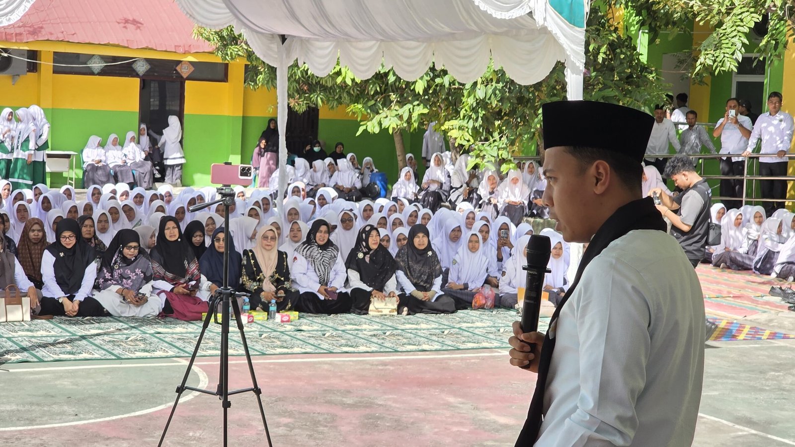 Ulama muda tersebut menyampaikan kajian inspiratif di hadapan 850 siswa yang dipusatkan di halaman tengah MAN 1 Pidie.
