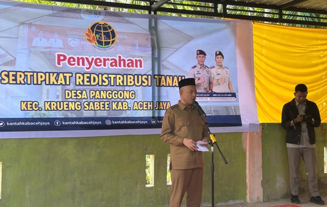 Penegasan itu disampaikan dalam sambutannya pada kegiatan penyerahan sertifikat redistribusi tanah kepada warga Desa Panggong, Kecamatan Krueng Sabee, Selasa 07 April 2026.