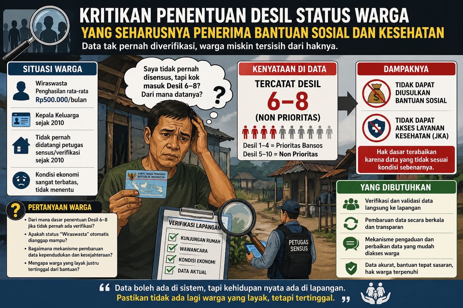 Kondisi ini memunculkan pertanyaan publik: bagaimana akurasi penetapan desil jika verifikasi faktual di lapangan tidak pernah dilakukan? Warga tersebut menilai, status “wiraswasta” pada KTP sering kali ditafsirkan sebagai indikator mampu, padahal kenyataannya banyak pelaku usaha kecil dengan penghasilan sangat minim.